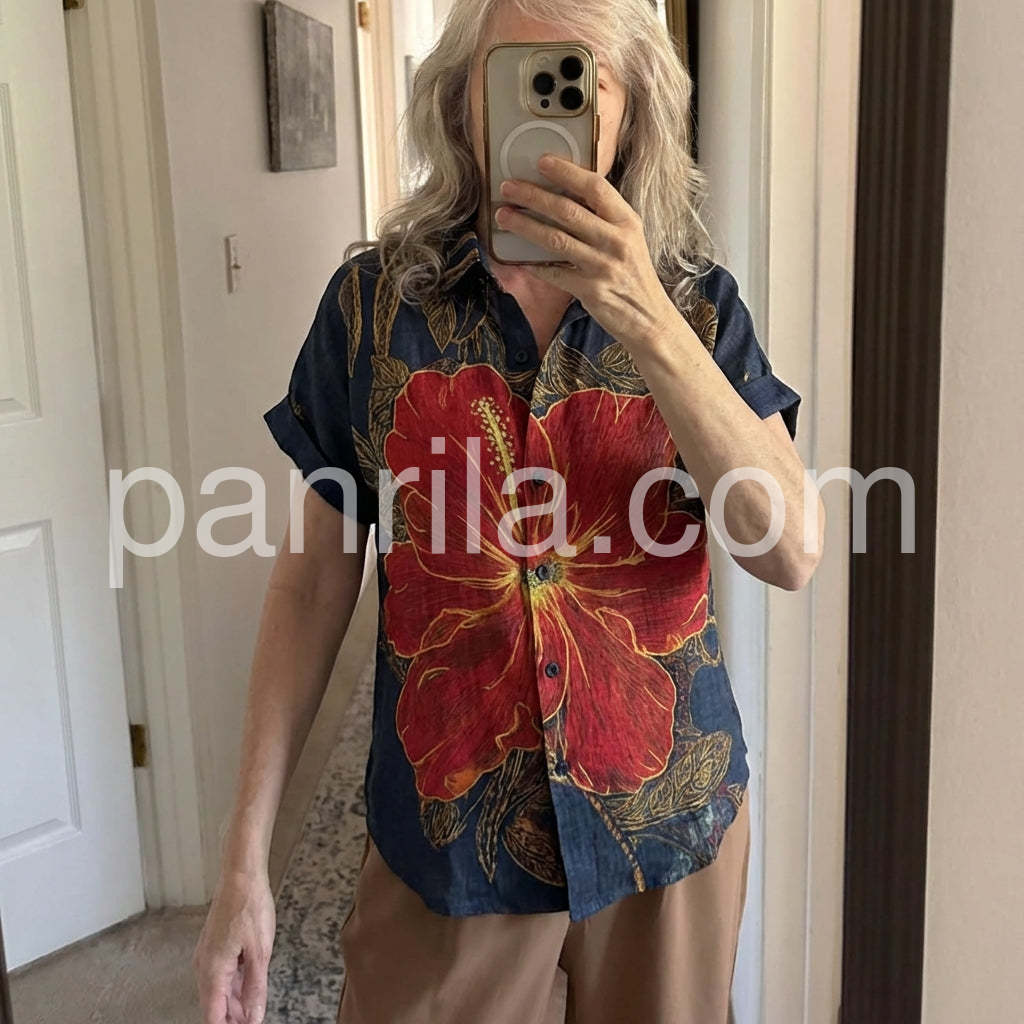 Channel island vibes with this Bold Tropical Hibiscus Print Top, a vibrant statement piece that brings the essence of paradise to your wardrobe. Crafted from lightweight, breathable fabric—likely cotton or linen blend—it features a rich navy base adorned with a striking oversized red hibiscus flower outlined in golden yellow, complemented by intricate leafy patterns throughout. The classic short-sleeve shirt design includes a relaxed fit, button-down front, and rolled sleeves for an effortless, laid-back look. Perfect for pairing with denim jeans, high-waisted shorts, or flowy skirts, this top is ideal for beach days, tropical getaways, or summer city strolls. Its bold floral motif exudes bohemian charm and exotic flair, making it a standout choice for those who love fashion with personality. Inspired by the playful, romantic styles found on sites like Lulus, this shirt effortlessly blends artistry and comfort—ideal for adding a splash of color and confidence to your warm-weather wardrobe.
