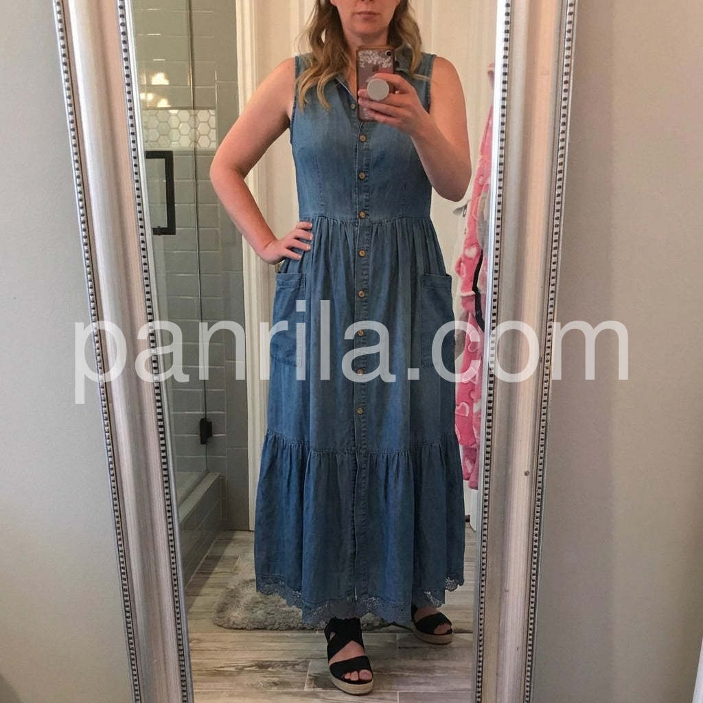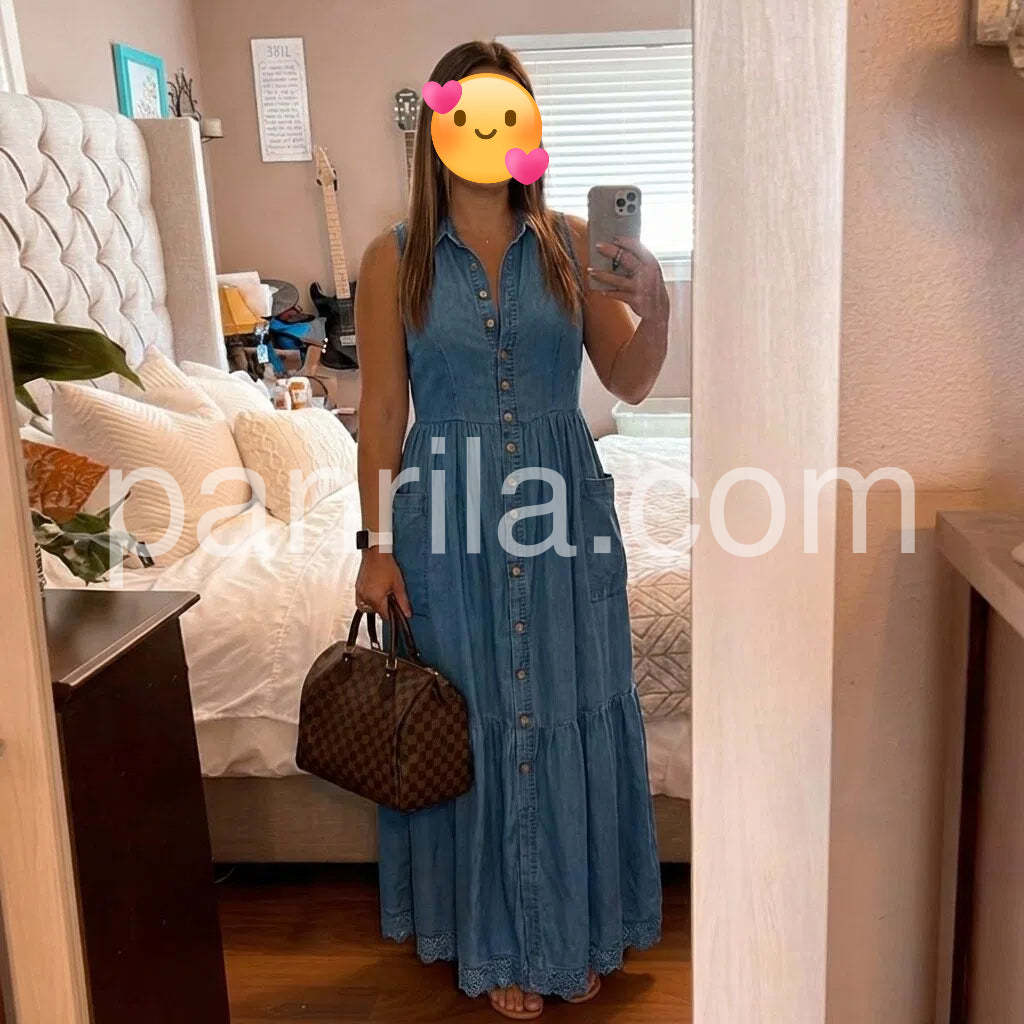 Crafted from premium denim, this sleeveless maxi dress combines timeless style with modern versatility. The flattering V-neckline and button-front closure create a refined silhouette that transitions effortlessly from casual daytime wear to evening occasions. The full-length cut offers elegant coverage while the structured denim fabric ensures durability and shape retention. Perfect for layering with jackets or cardigans, this wardrobe essential delivers both comfort and sophisticated appeal.