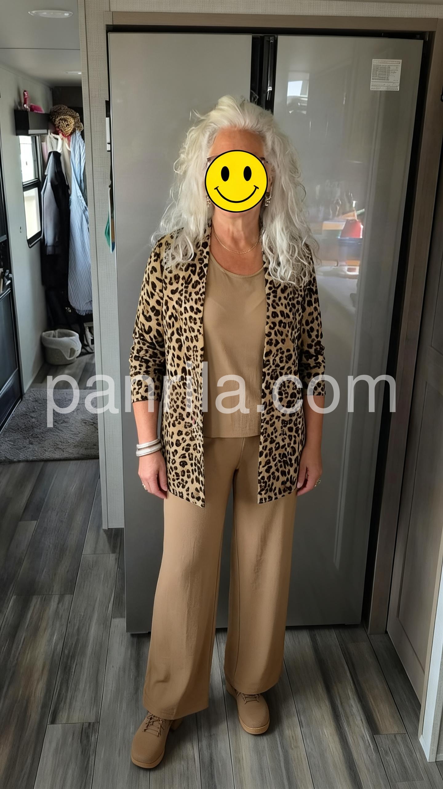 This coordinated set includes a leopard-print top, matching wide-leg pants, and a lightweight duster cardigan in warm brown tones. The relaxed fit offers comfort with a stylish edge. Perfect for casual outings or elevated loungewear. Effortlessly trendy with a wild, boho flair. Ideal for spring and summer layering.