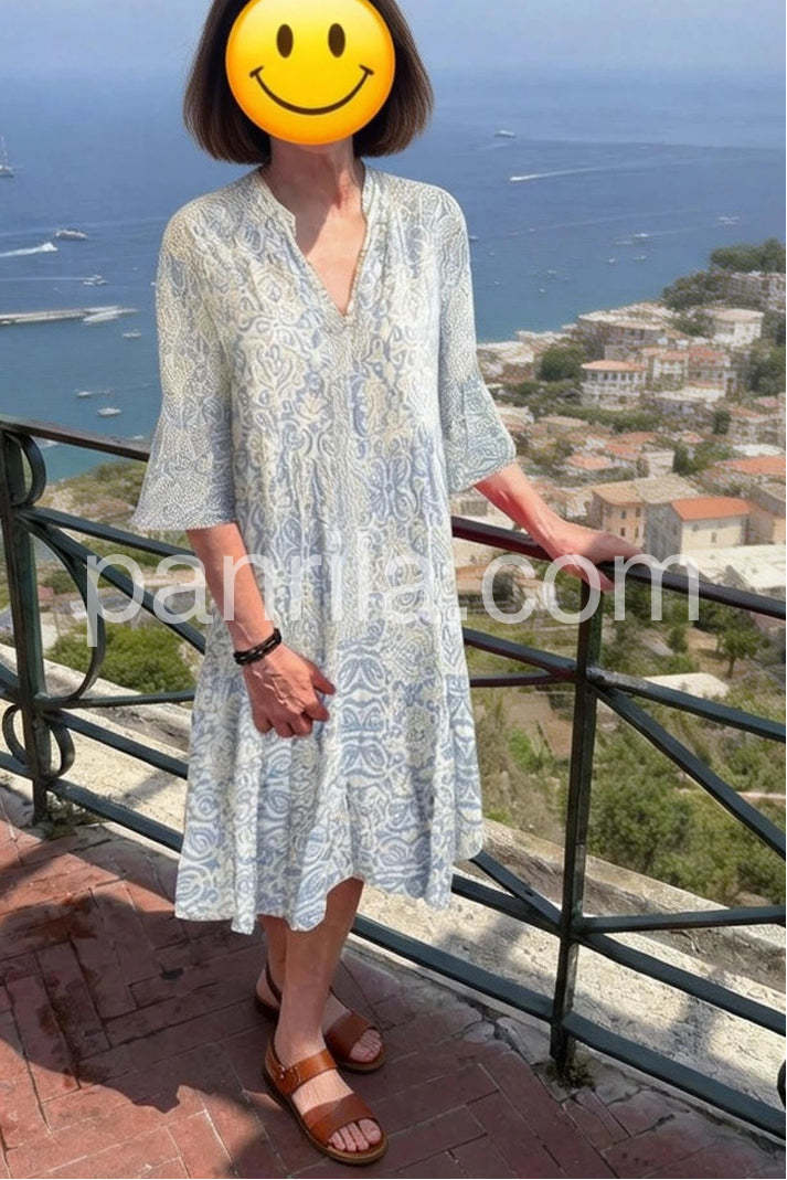 This pleated mini dress is all you need this summer for a style pick-me-up. The short half sleeves flair on the ends offers the perfect complement to the vintage-inspired all-over weathered blue and white print. The deep v-neck collar and round neckline make it easy to layer with your favorite necklaces and jackets.
