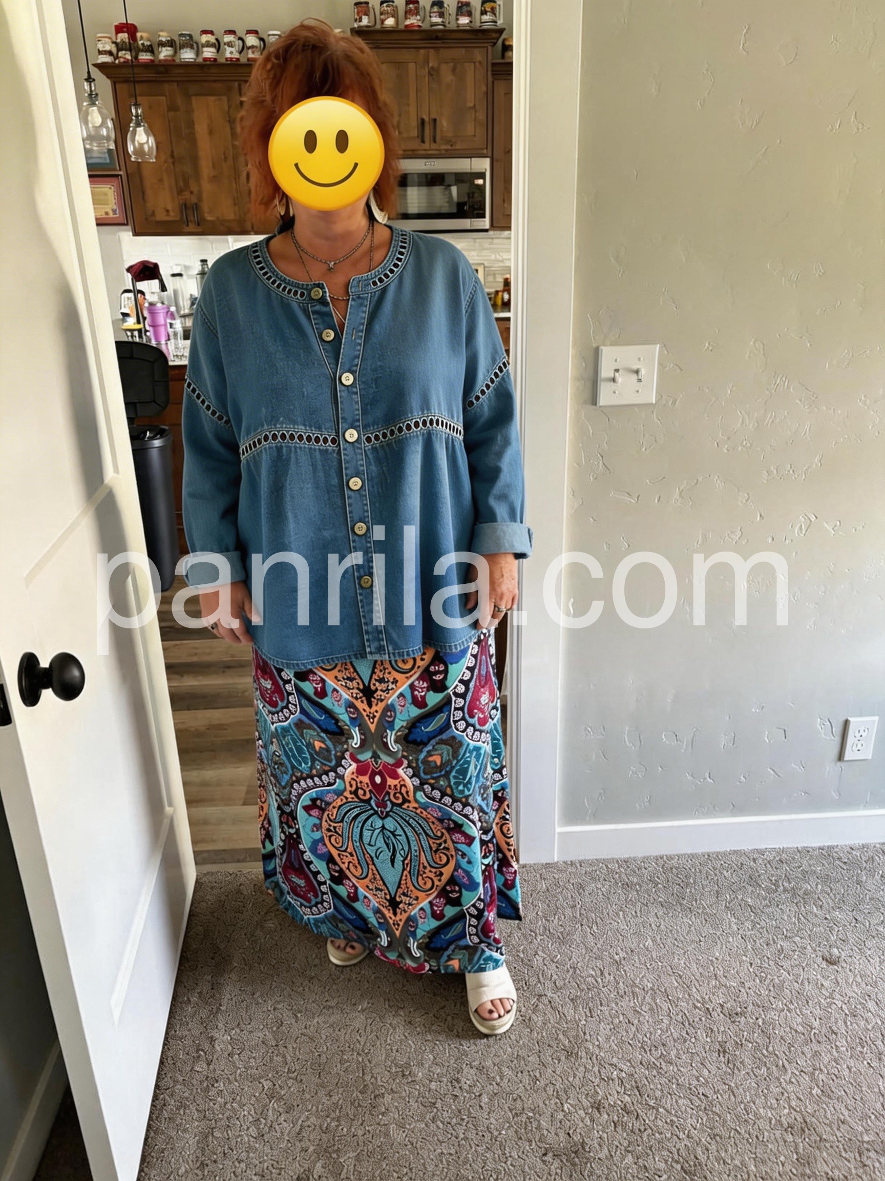Embrace laid-back elegance in this Blue Denim Button Down Top with Embroidered Trim, a stylish and comfortable piece that blends classic denim appeal with artisanal details. Crafted from soft, medium-wash denim fabric, this tunic features a relaxed, oversized silhouette with a flattering round neckline and front button closure, offering both ease and timeless charm. The standout design element is the decorative embroidered trim—featuring a delicate dotted pattern—accenting the neckline and waistline, adding a touch of boho flair and texture. Styled here with layered necklaces, bracelets, and distressed denim bottoms, it’s ideal for weekend errands, coffee dates, or a leisurely walk through the city.