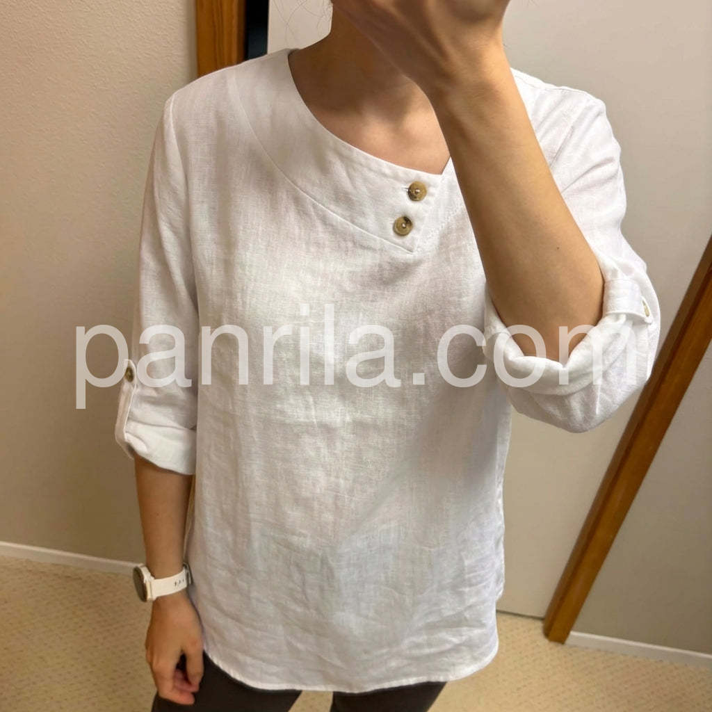 Elevate your everyday style with this Minimalist White Button-Trimmed Blouse, a clean and sophisticated piece that blends simplicity with subtle detail. Crafted from soft, breathable linen-like fabric, this long-sleeve top features an elegant asymmetrical collar that drapes gracefully over the chest, secured with two delicate gold-tone buttons for a touch of understated luxury. The sleeves are finished with matching button cuffs, allowing you to roll them up for a relaxed look or keep them down for a polished silhouette. Designed with a relaxed fit and a slightly curved hem, it pairs beautifully with jeans, high-waisted pants, or skirts—perfect for casual outings, brunch dates, or office wear. Inspired by the curated, minimalist-chic styles found on Lulus.com, this blouse brings effortless elegance to any outfit. Whether dressed up with heels or worn casually with sneakers, it’s a versatile wardrobe staple that celebrates timeless design and comfort. A must-have for women who love clean lines, neutral tones, and refined details.