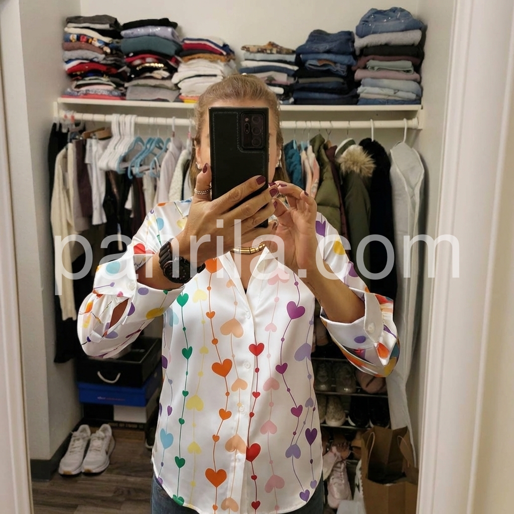 Elevate your wardrobe with this sophisticated satin blouse, featuring an enchanting heart print that adds a touch of romance to any ensemble. Crafted from luxurious satin fabric, this long-sleeve piece drapes beautifully while maintaining a polished silhouette. The smooth, lustrous finish catches light gracefully, making it ideal for both professional settings and evening occasions. Versatile enough to pair with tailored trousers or flowing skirts, this blouse seamlessly transitions from day to night. Perfect for those seeking refined elegance with a subtle hint of charm.