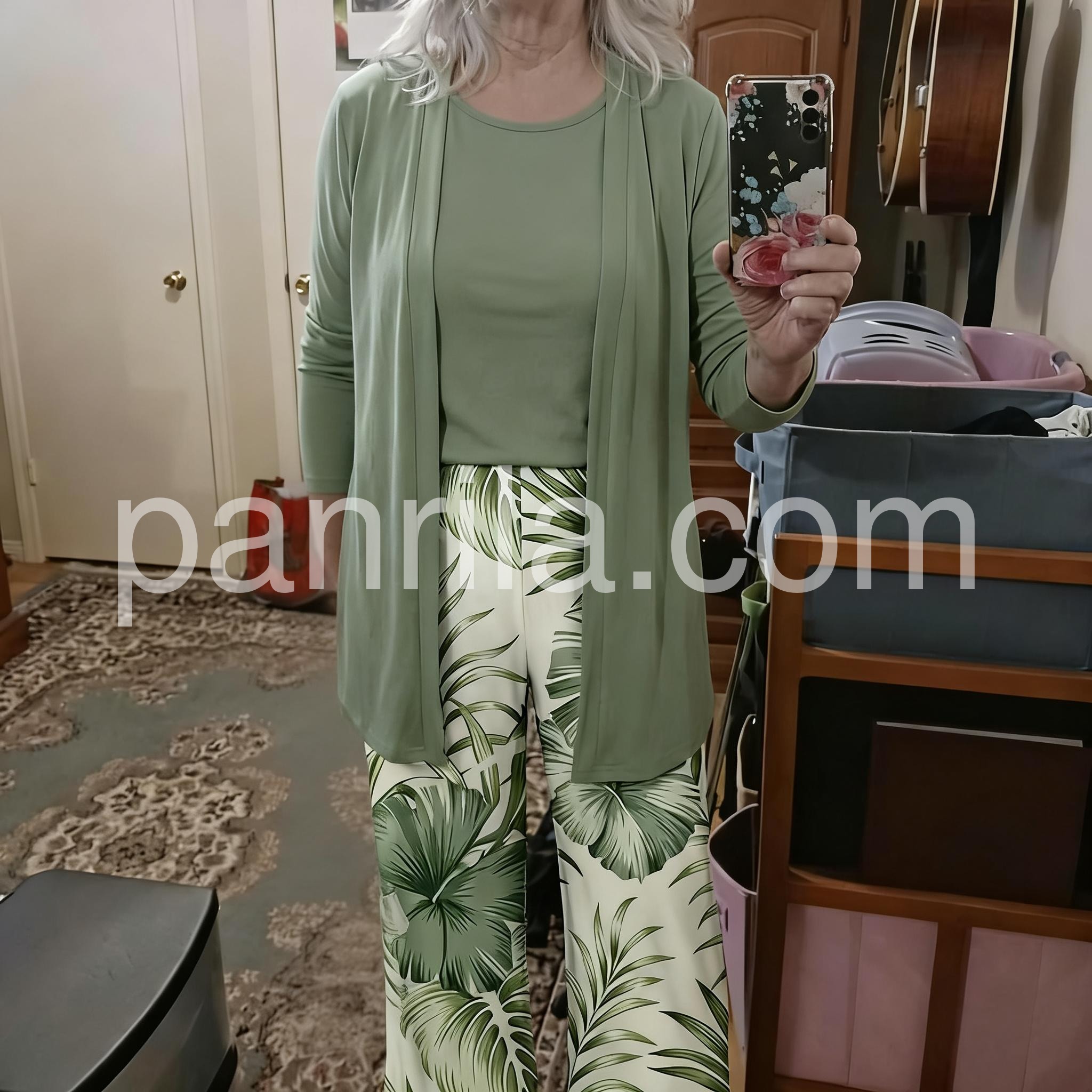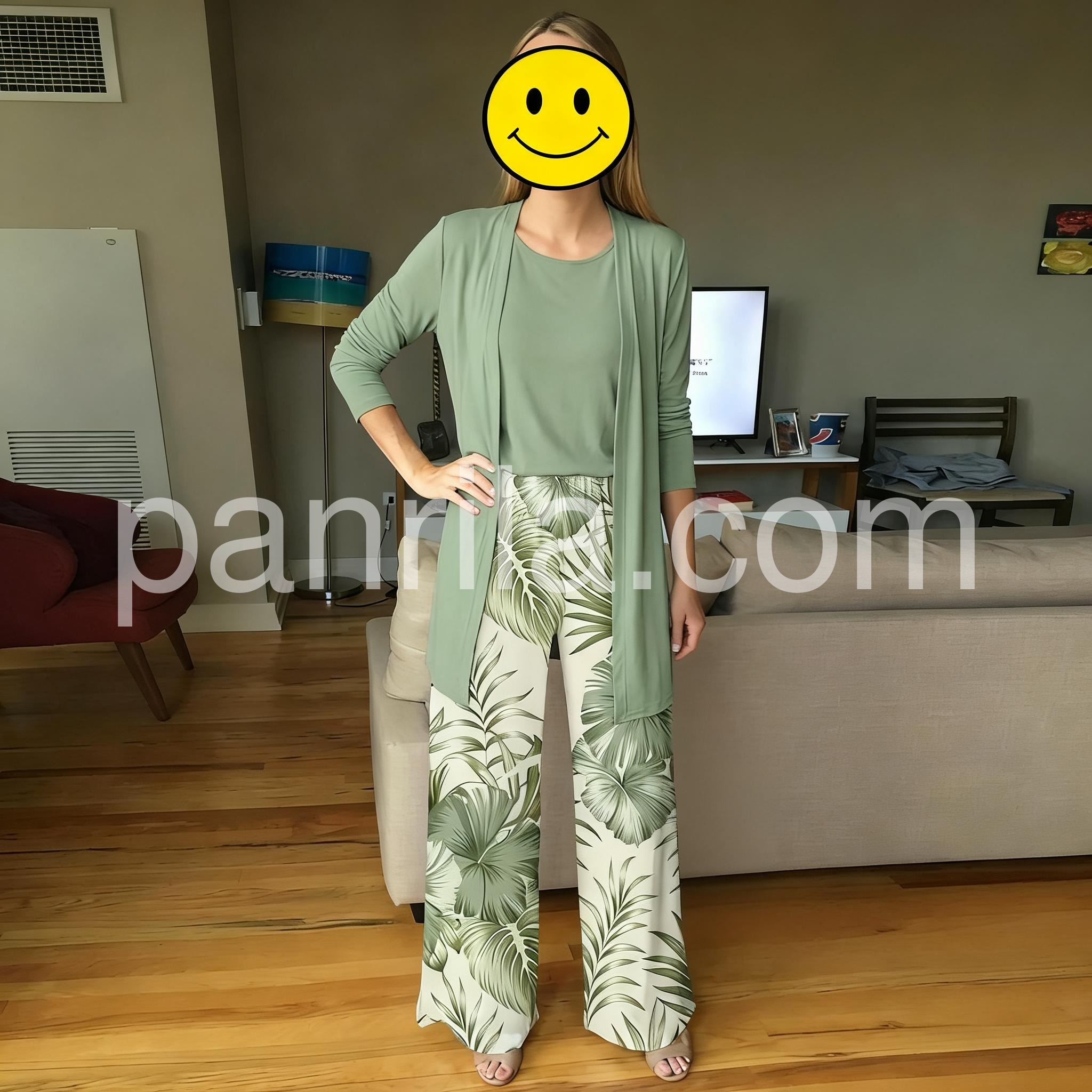 This three-piece set features a soft sage green drape cardigan with a relaxed fit. Paired with wide-leg pants in a leafy tropical print for a fresh, nature-inspired look. Lightweight fabric ensures comfort and breathability. Ideal for casual outings or warm-weather days. Effortlessly chic with a touch of boho elegance.