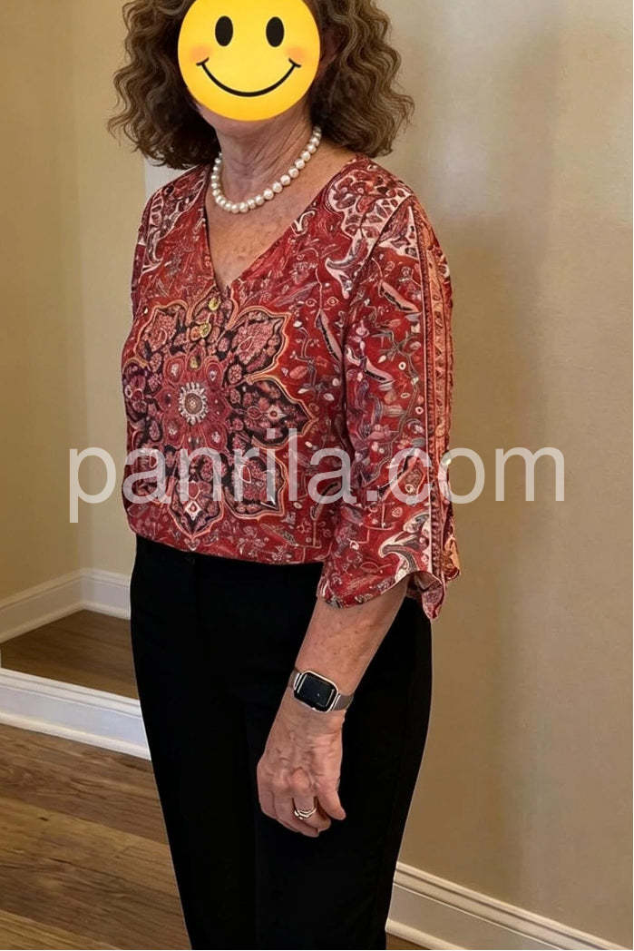 A vibrant bohemian blouse featuring an intricate red paisley print. This elegant top showcases a classic V-neckline adorned with delicate buttons, adding a touch of sophistication. The three-quarter length flared sleeves create a flowy, feminine silhouette, perfect for both casual outings and more dressed-up occasions. Crafted from lightweight, breathable fabric, it ensures comfort all day long.
