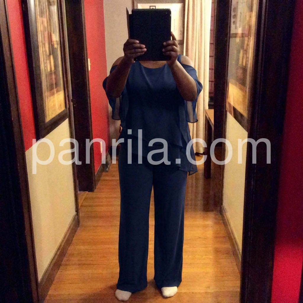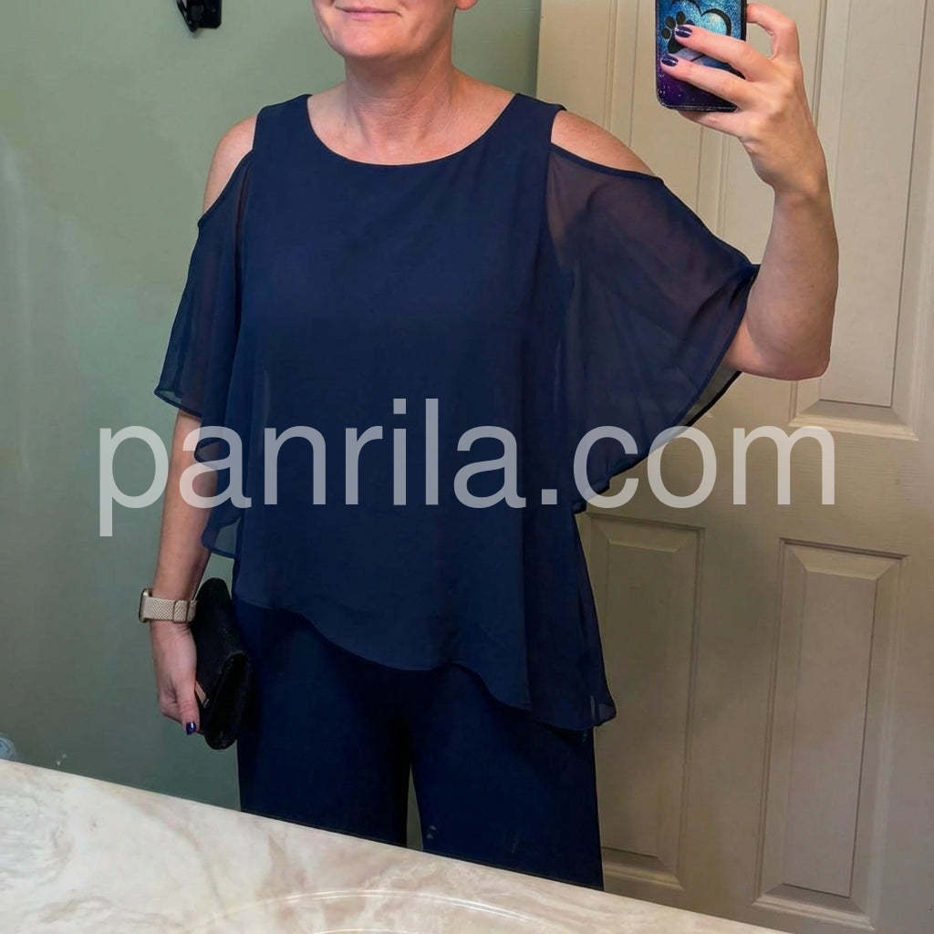 This fashionable two-piece set includes a navy cold shoulder three-quarter length draped sleeves and asymmetrically layered ruffled top and pants. Crafted from lightweight and soft materials, this set is perfect for any occasion. Step up your look with this stylish set.