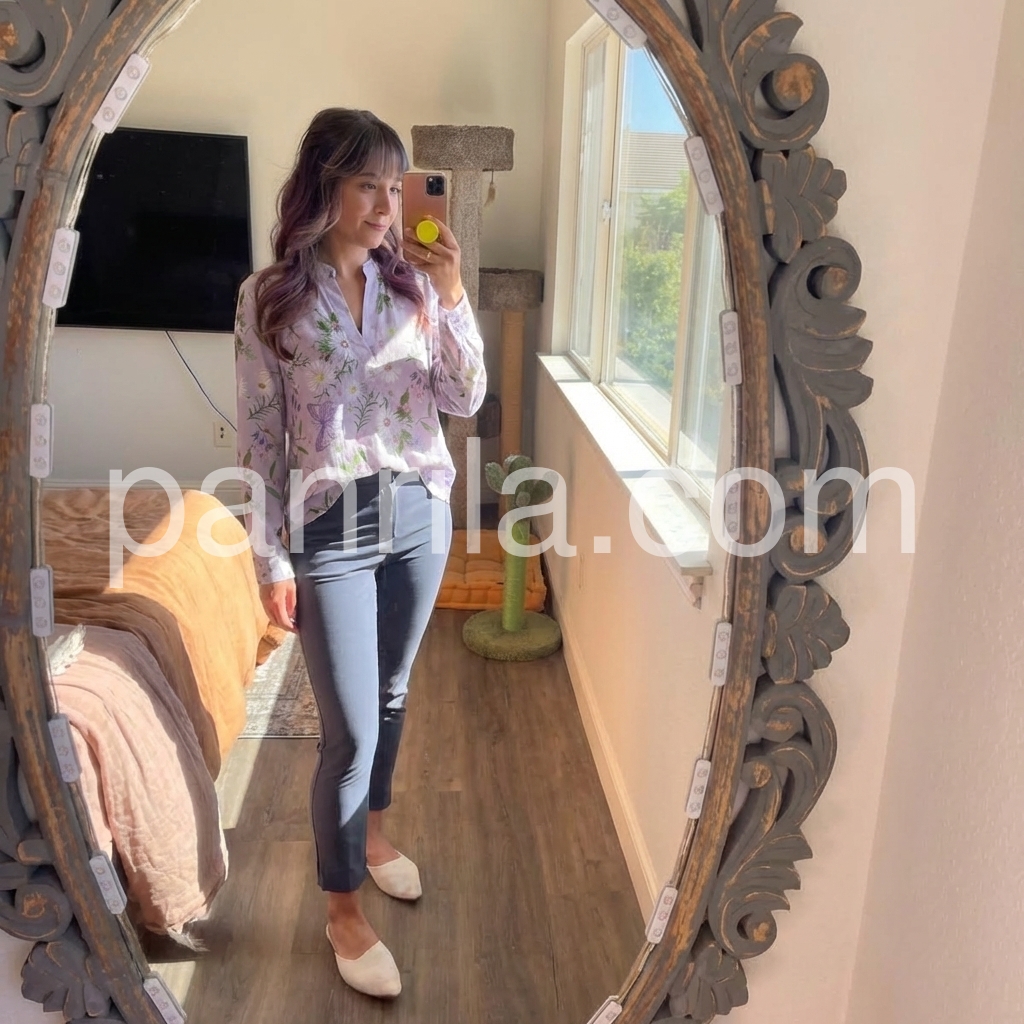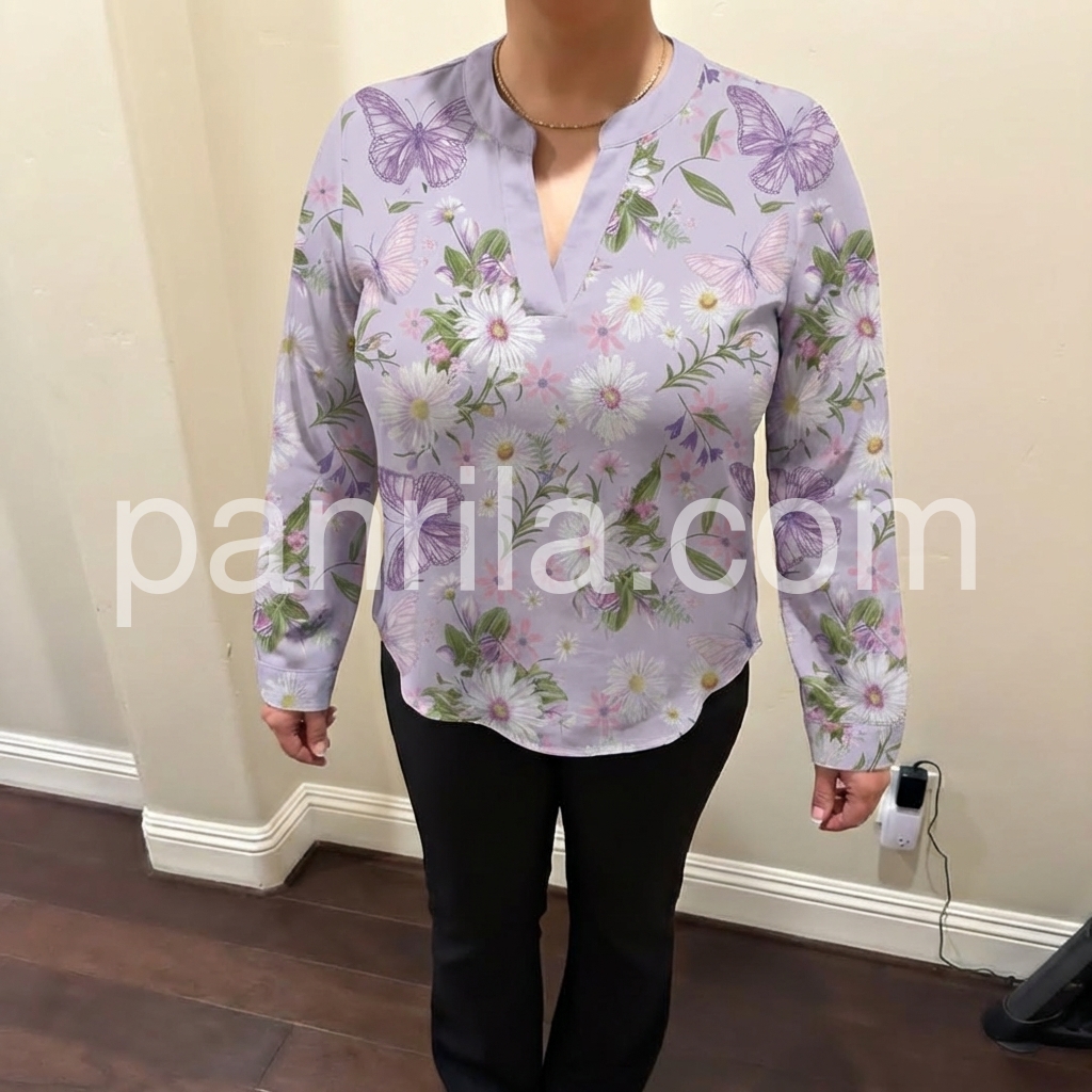 This long-sleeve top features a delicate lavender base with floral and butterfly prints. The keyhole neckline adds a touch of elegance. Lightweight fabric for comfort and breathability. Perfect for spring or casual outings. Pair with jeans or skirts for effortless style.