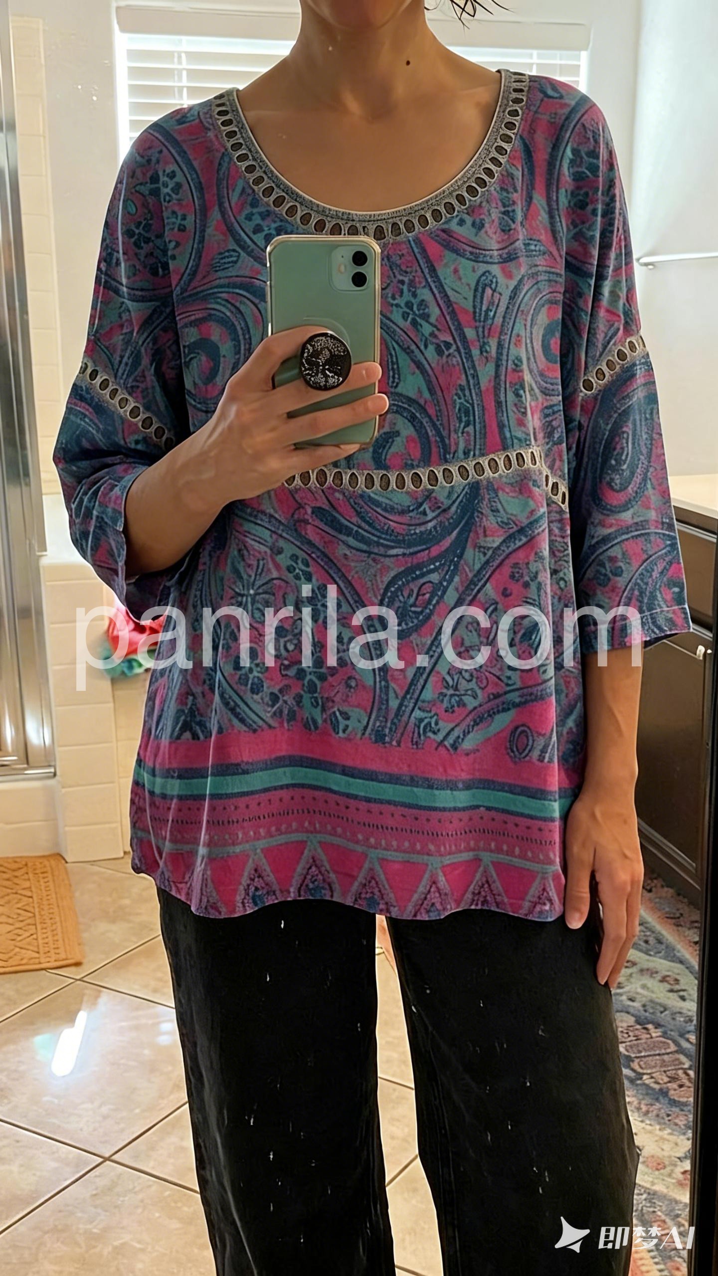 Embrace free-spirited fashion with this Special Paisley Print Round Neck Top, a bold and artistic statement piece that brings vibrant energy to any outfit. Crafted from soft, lightweight fabric—likely cotton or rayon blend—this relaxed-fit tunic features an eye-catching paisley pattern in rich shades of deep purple, teal, and fuchsia, accented with intricate tribal-inspired motifs. The design is elevated by delicate black circular trim along the neckline, sleeves, and waistband, adding a touch of bohemian flair and contrast. With its three-quarter sleeves and slightly asymmetrical hem, this top drapes beautifully over jeans, leggings, or skirts, making it perfect for casual outings, music festivals, or weekend adventures. Layer it with layered necklaces, bracelets, and sandals for a full-on boho look—just like in this Lulus-inspired ensemble. Ideal for those who love expressive prints and effortless style, this tunic combines comfort, color, and cultural artistry into one wearable masterpiece. A must-have for anyone craving a touch of wanderlust in their wardrobe.