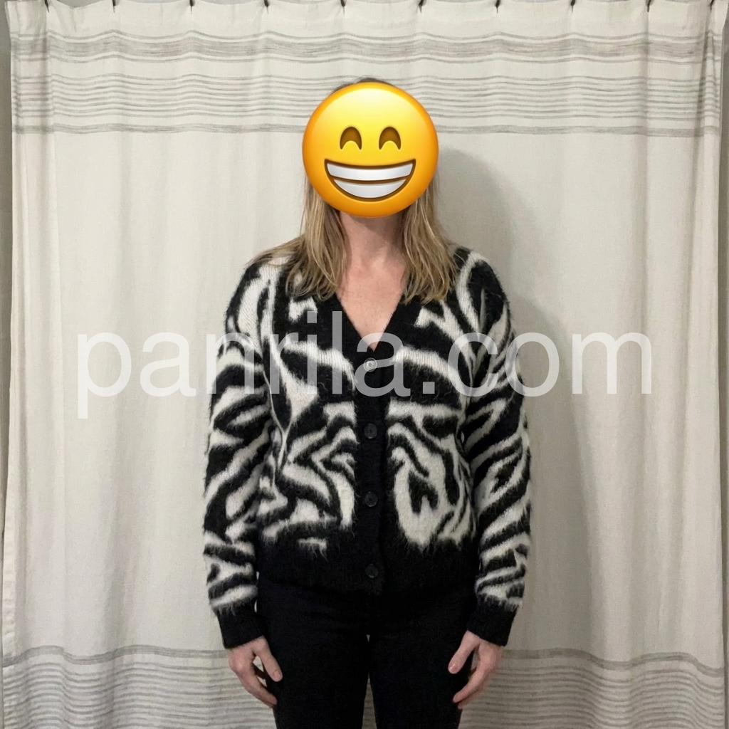Elevate your wardrobe with this bold zebra-print knit cardigan crafted from a luxurious soft mohair blend. Its distinctive pattern adds a striking visual contrast, while the mohair fibers ensure lightweight warmth and a plush texture. Designed for both style and comfort, this cardigan is ideal for layering during transitional seasons, providing a sophisticated yet edgy statement piece to your collection.