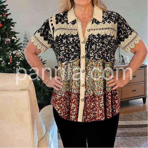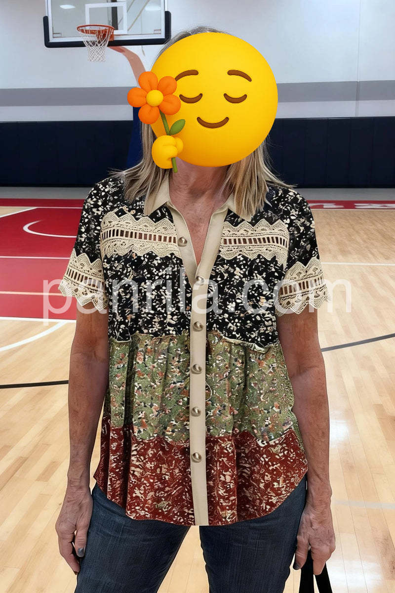 Elevate your everyday style with this charming Women's Vintage Patchwork Floral Blouse. Crafted with a unique combination of three distinct floral prints in navy, sage, and rust, this shirt offers a fresh and bohemian look. The classic collar and full button-front closure add a touch of sophistication, while the delicate lace detailing on the shoulders and cuffs introduces a feminine and elegant flair. The loose, flowing silhouette ensures a comfortable and flattering fit for all body types, making it perfect for pairing with jeans, shorts, or skirts. Whether you're heading out for a casual brunch or a day of shopping, this versatile blouse will keep you looking effortlessly chic.