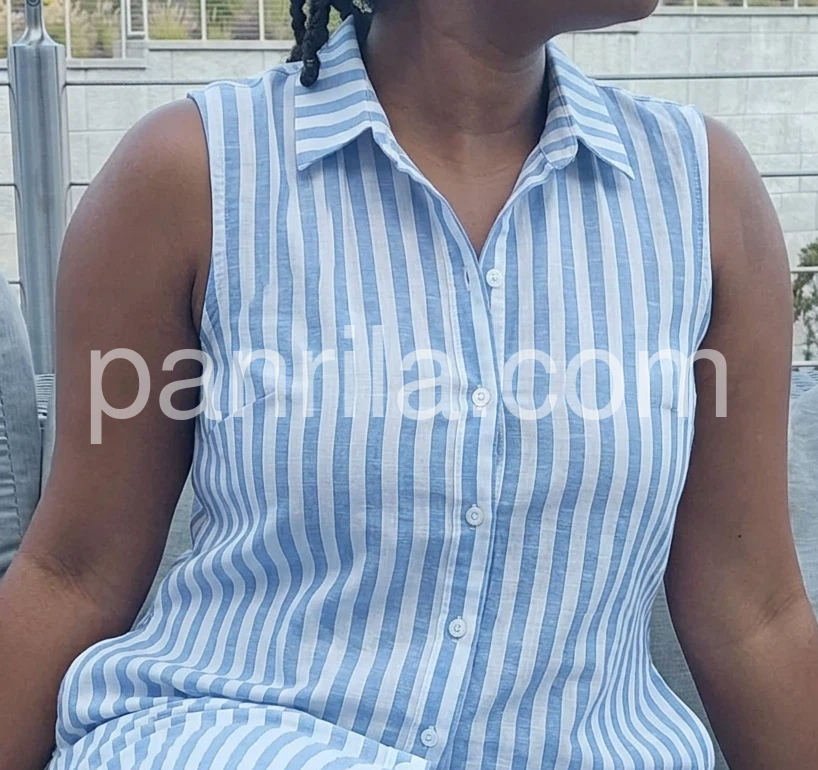 This striped sleeveless shirt dress features a classic blue and white vertical pattern with a relaxed, effortless fit. The collared neckline and front button closure add a polished touch, while the asymmetrical hem offers a modern twist. Lightweight and breathable, it’s perfect for casual summer days. Ideal for beach outings, brunches, or laid-back errands. Pair with sandals or sneakers for a fresh, coastal look.