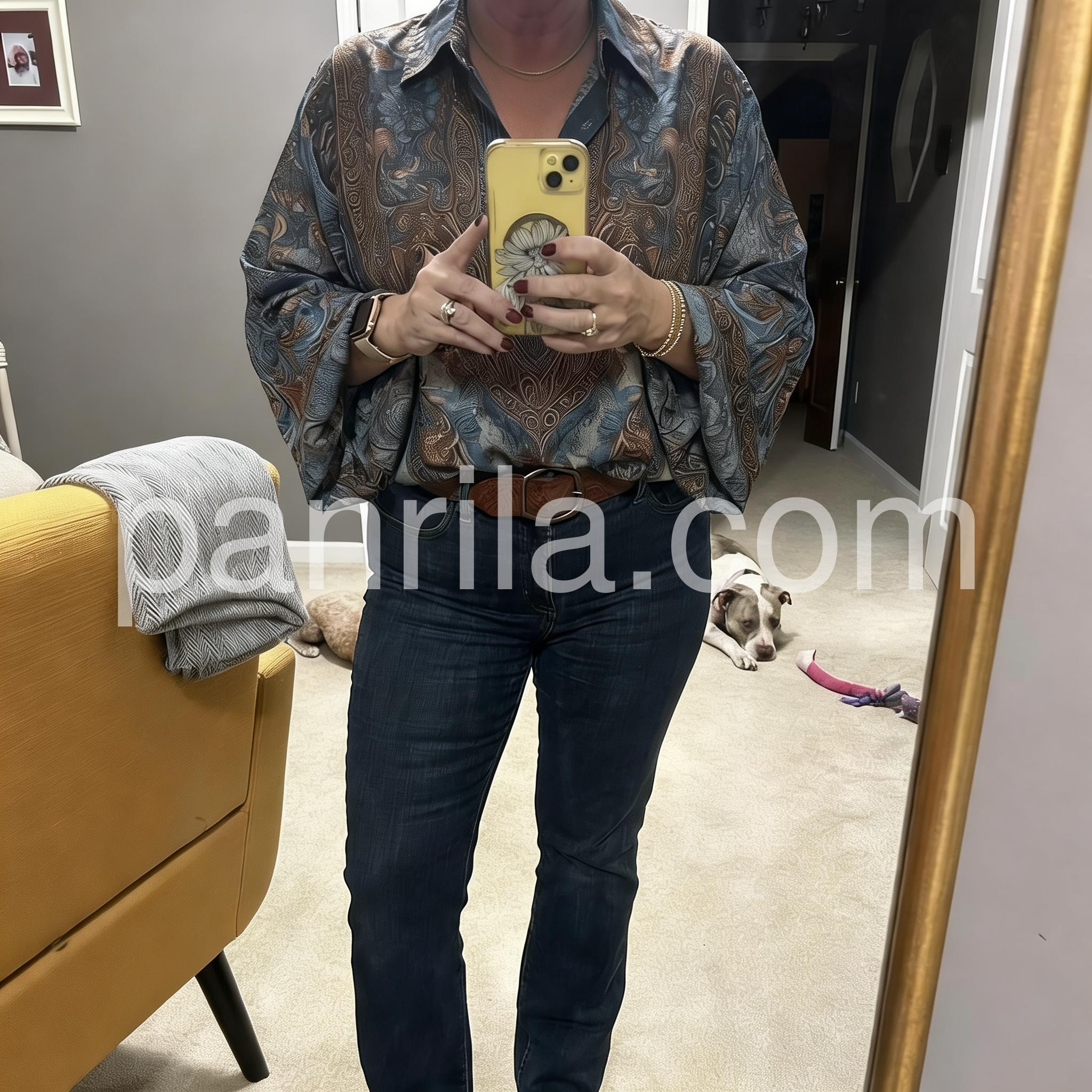 Crafted from premium silk, this bohemian blouse showcases an intricate blue print that captures effortless elegance. The relaxed silhouette and flowing fabric create natural movement, making it ideal for layering or wearing solo. Perfect for transitional seasons, this versatile piece pairs seamlessly with denim, linen trousers, or skirts. The breathable silk construction ensures comfort throughout the day while maintaining a refined, polished appearance. A timeless addition to any wardrobe seeking understated sophistication with artistic flair.
