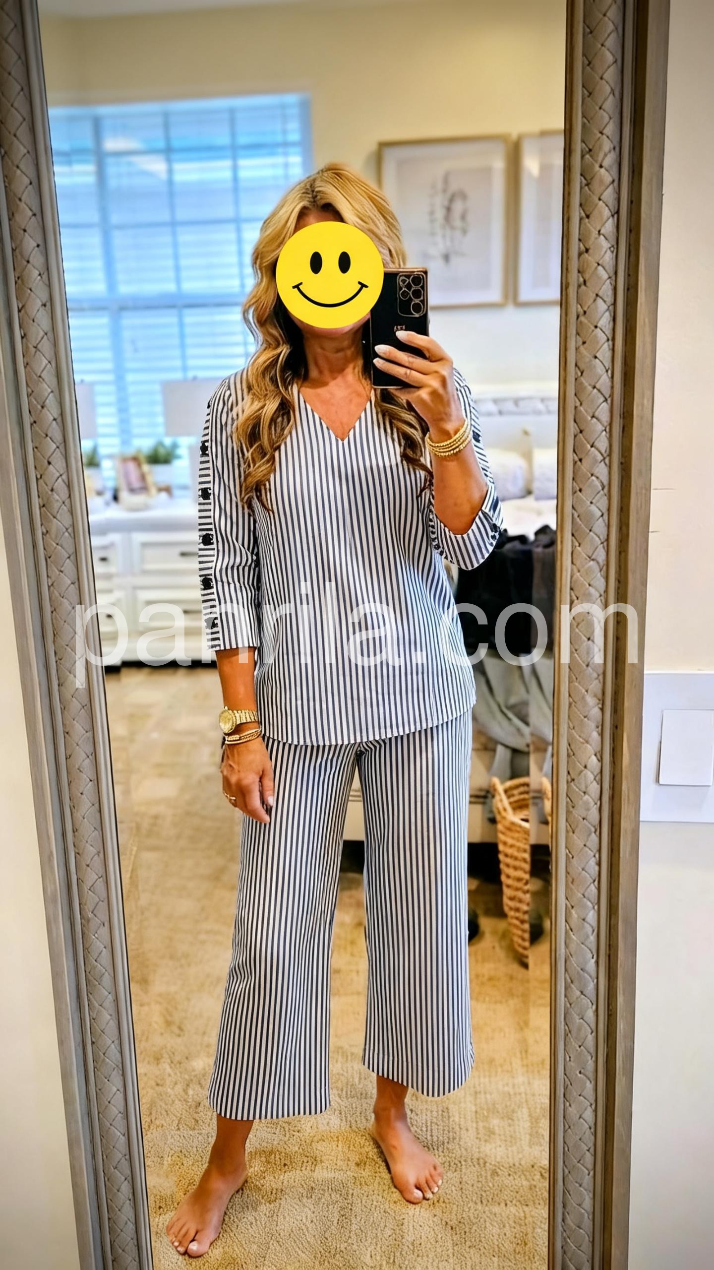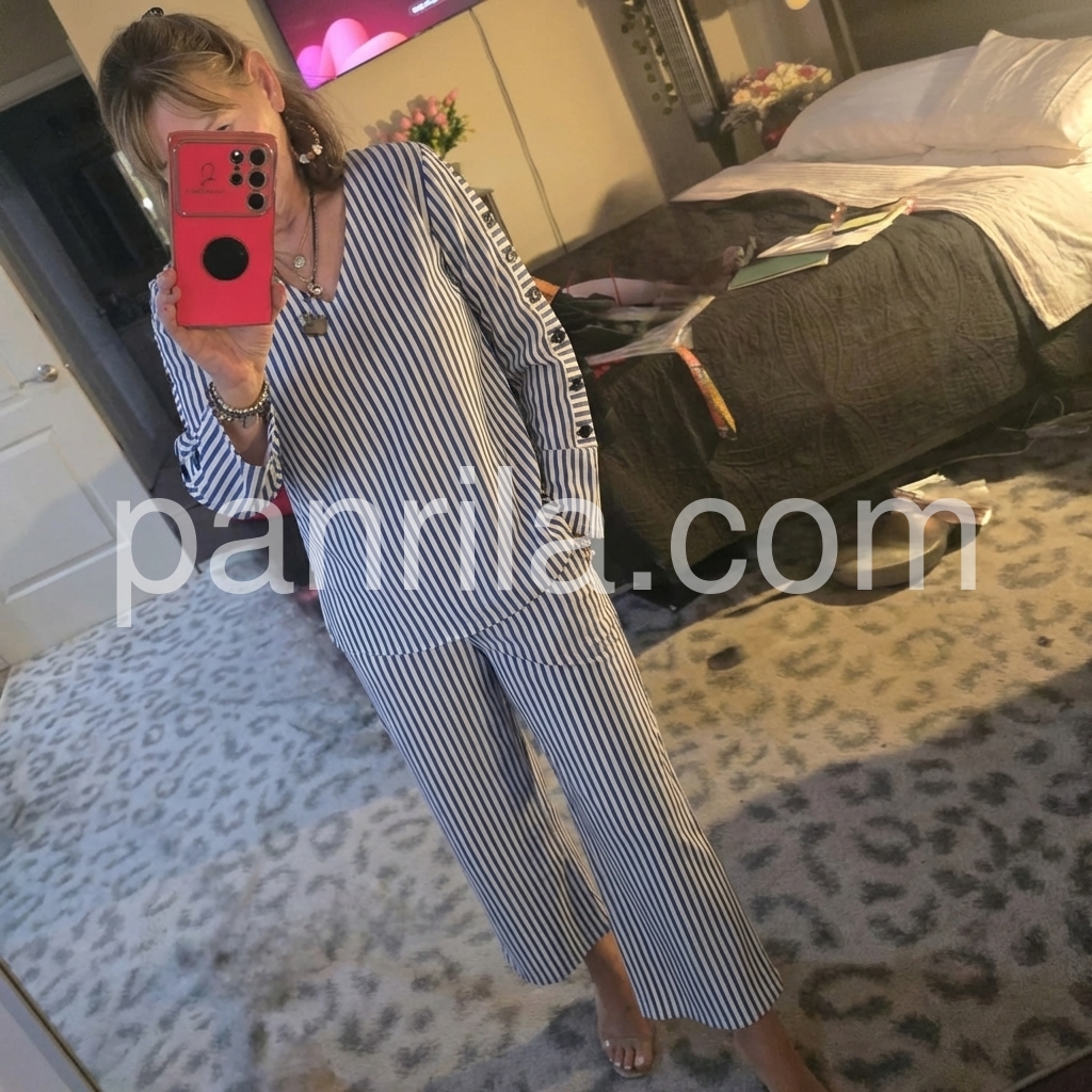 This coordinated set features a relaxed V-neck top and wide-leg cropped pants in classic blue and white stripes. The long sleeves with decorative side buttons add a stylish detail. Lightweight fabric perfect for warm weather. Ideal for casual outings or smart-casual events. Effortlessly elegant and easy to wear.